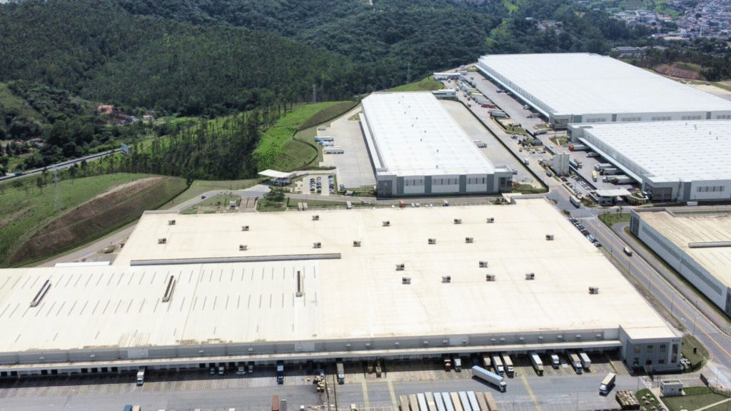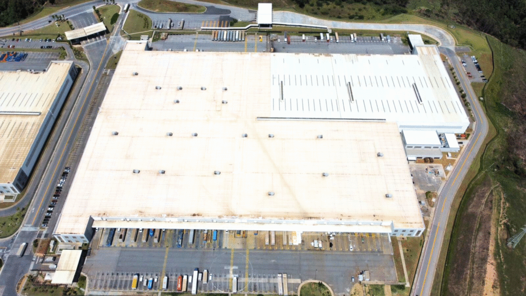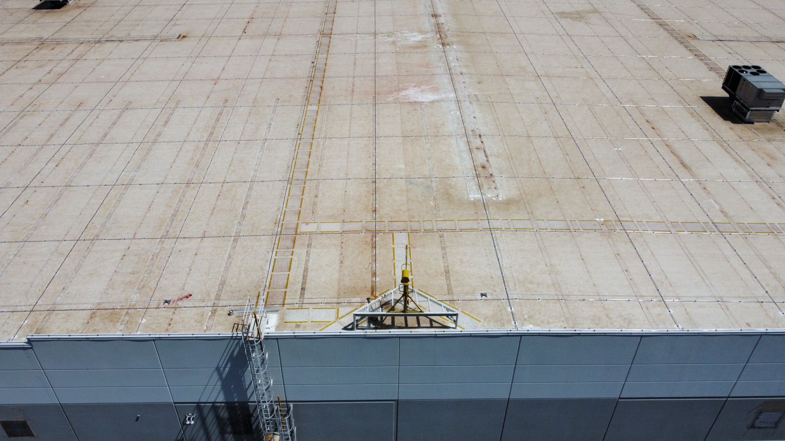 Escopo: instalação de duas camadas de PIR+TPO branco. Acabamentos do perímetro, revestimento das bases dos domus, instalação de suportes para SPDA e passarela walkway.