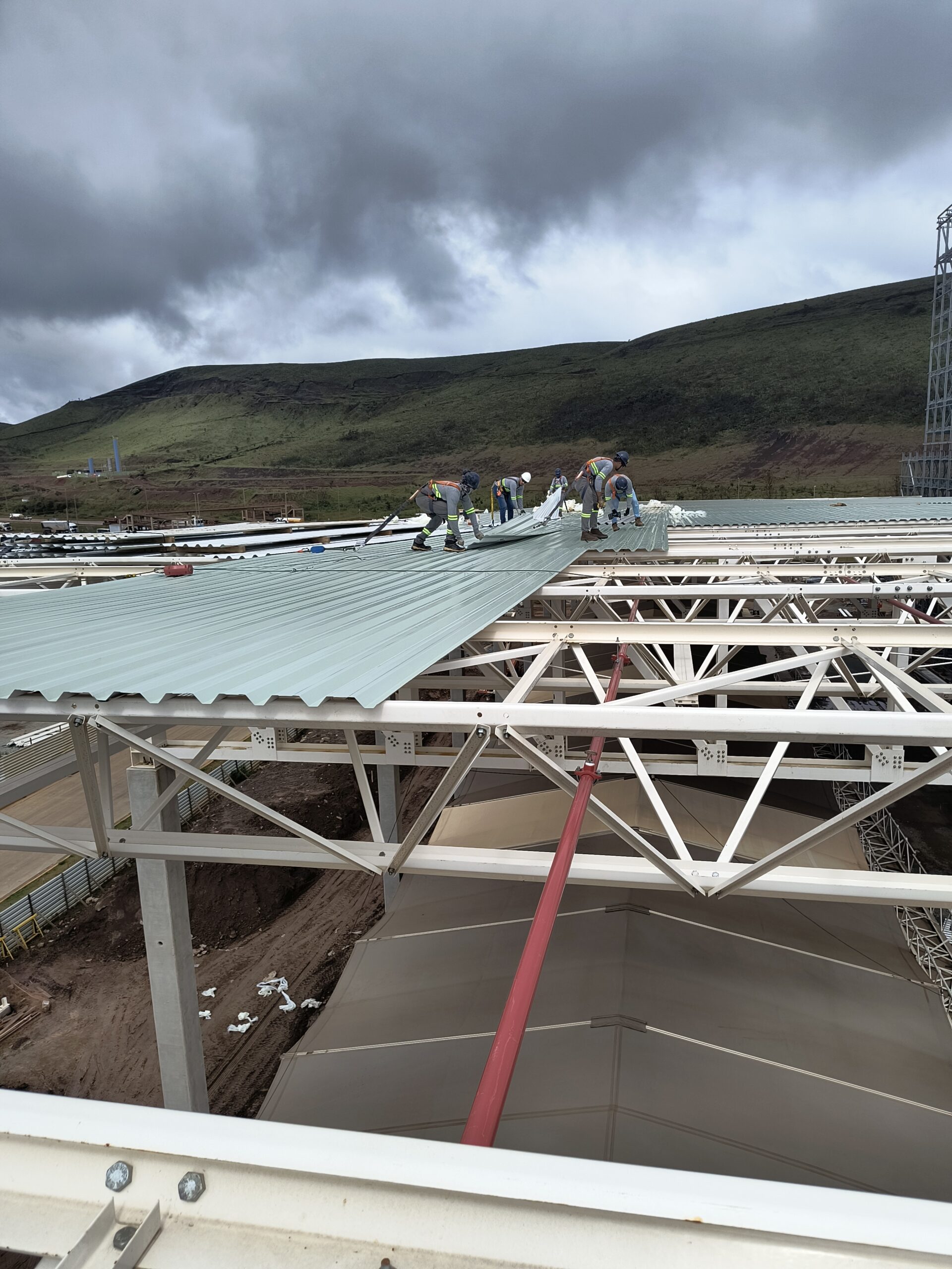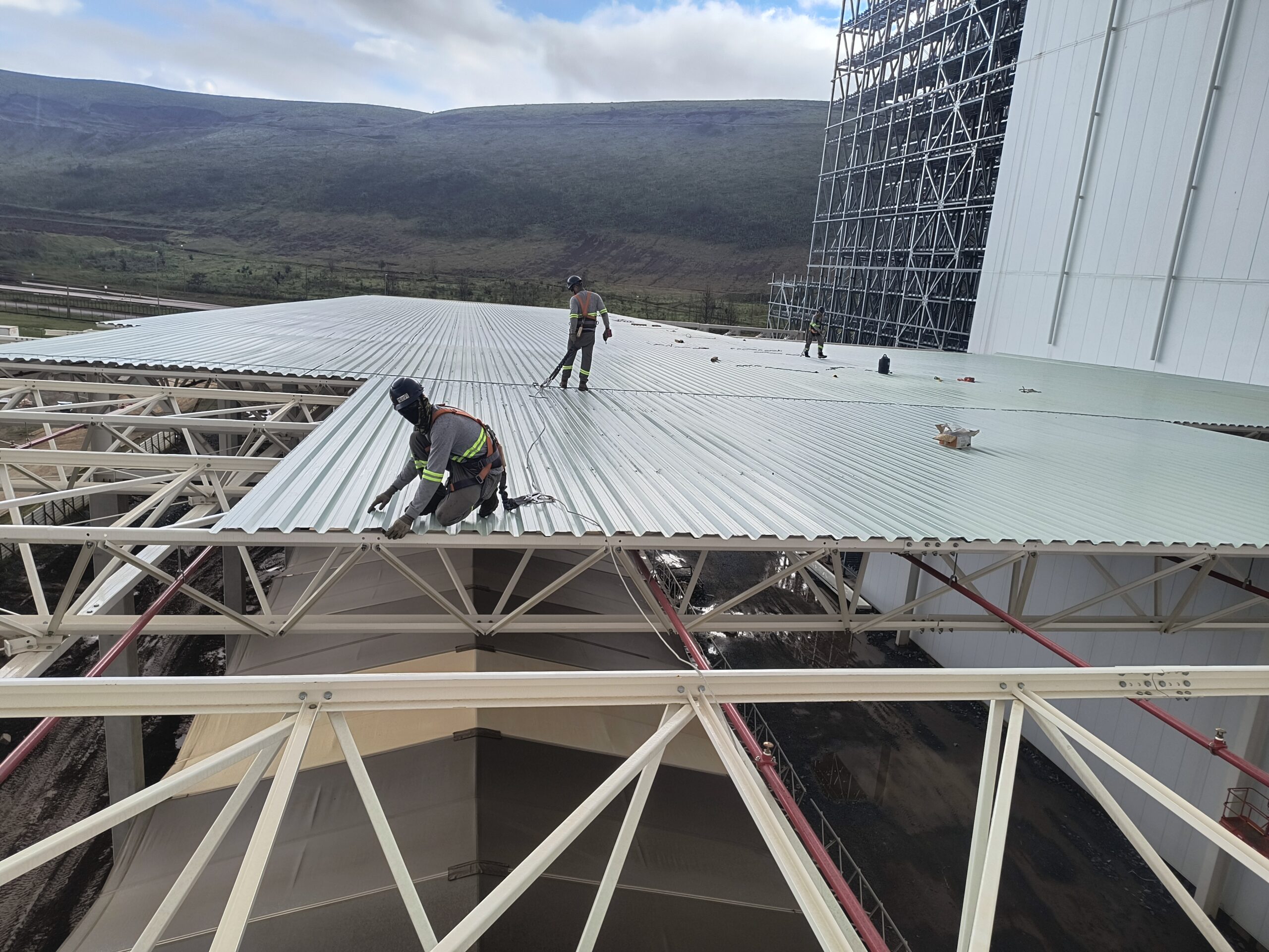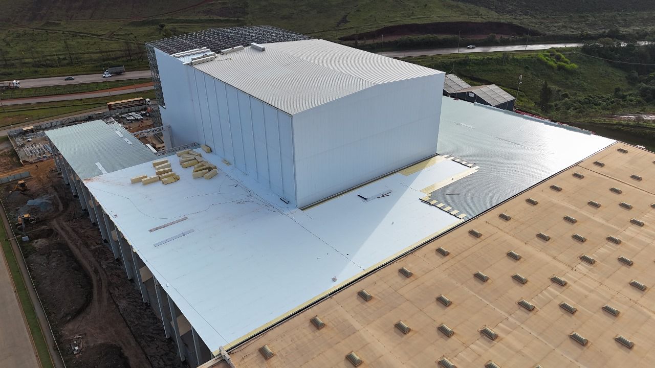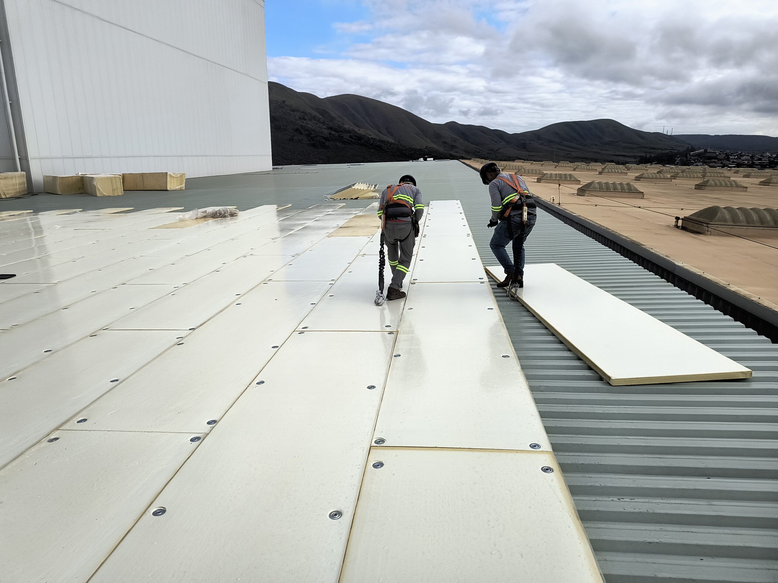 Escopo: Instalação de telhas trapezoidais TP40 + PIR + TPO branco + revestimento de 12calhas + revestimento base dos domus + instalação de passarela walkway.