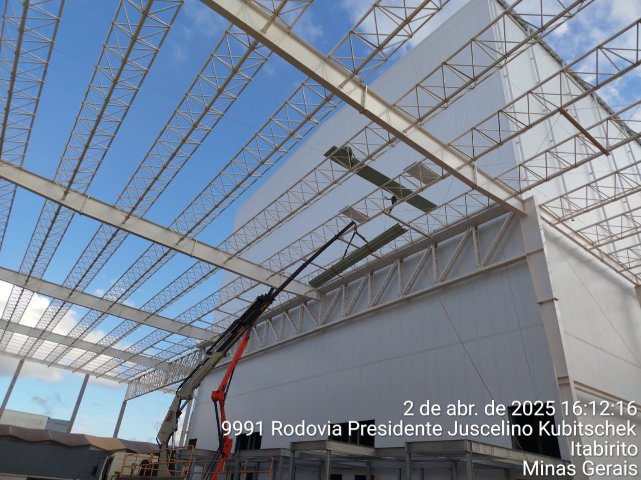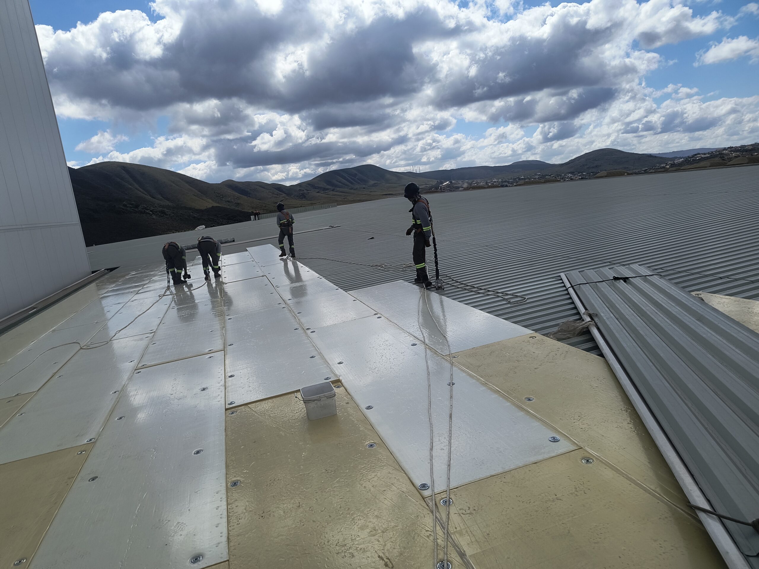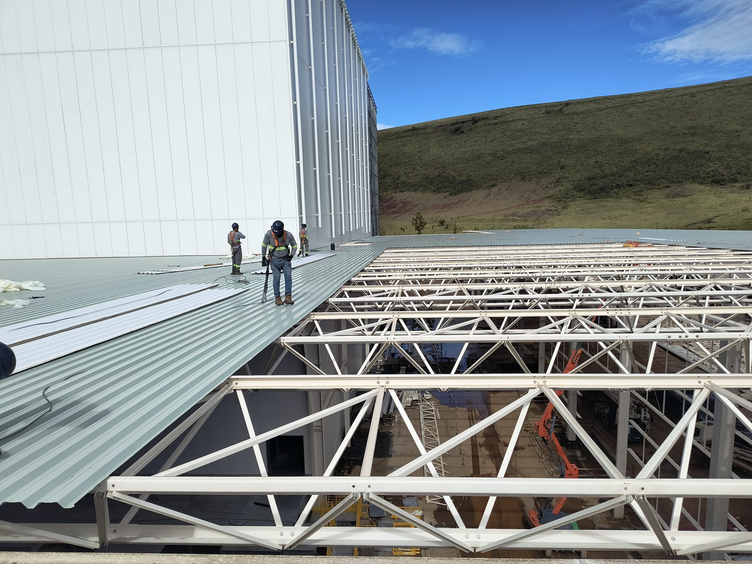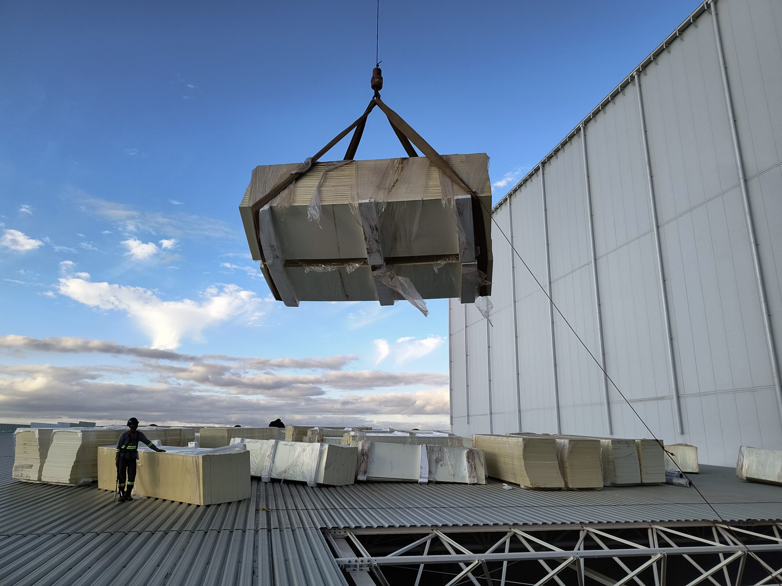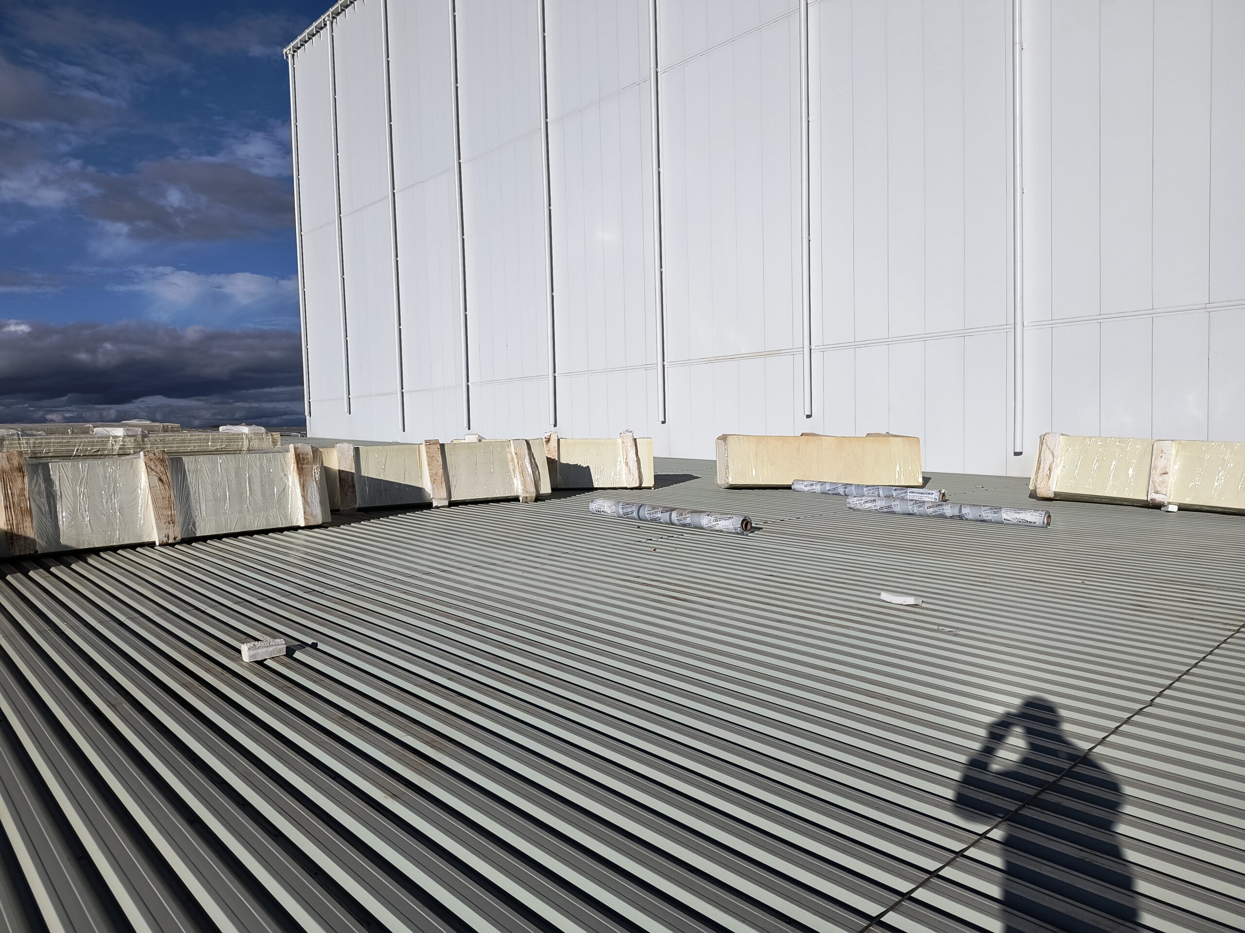 Escopo: Instalação de telhas trapezoidais TP40 + PIR + TPO branco + revestimento de 12calhas + revestimento base dos domus + instalação de passarela walkway.