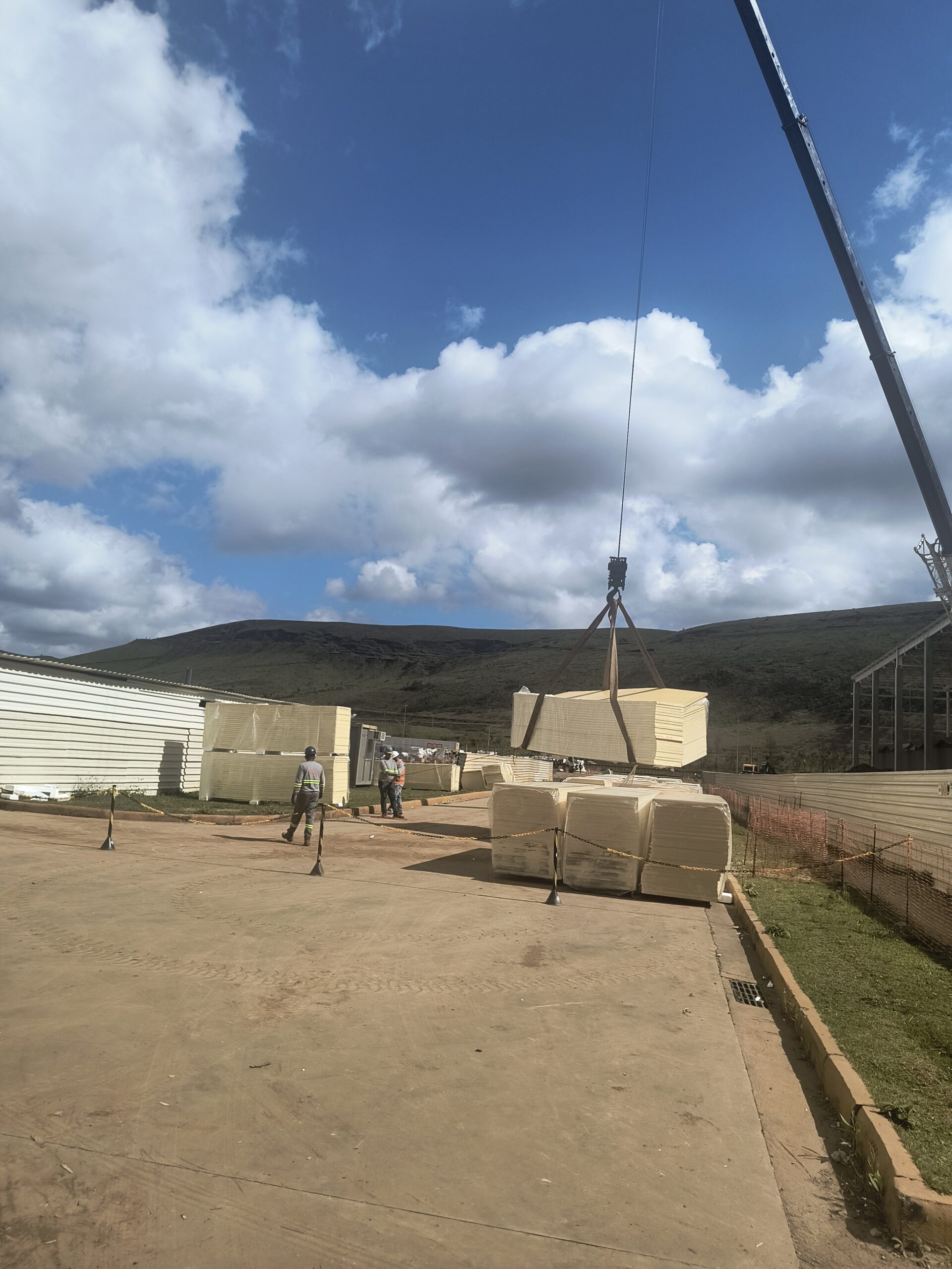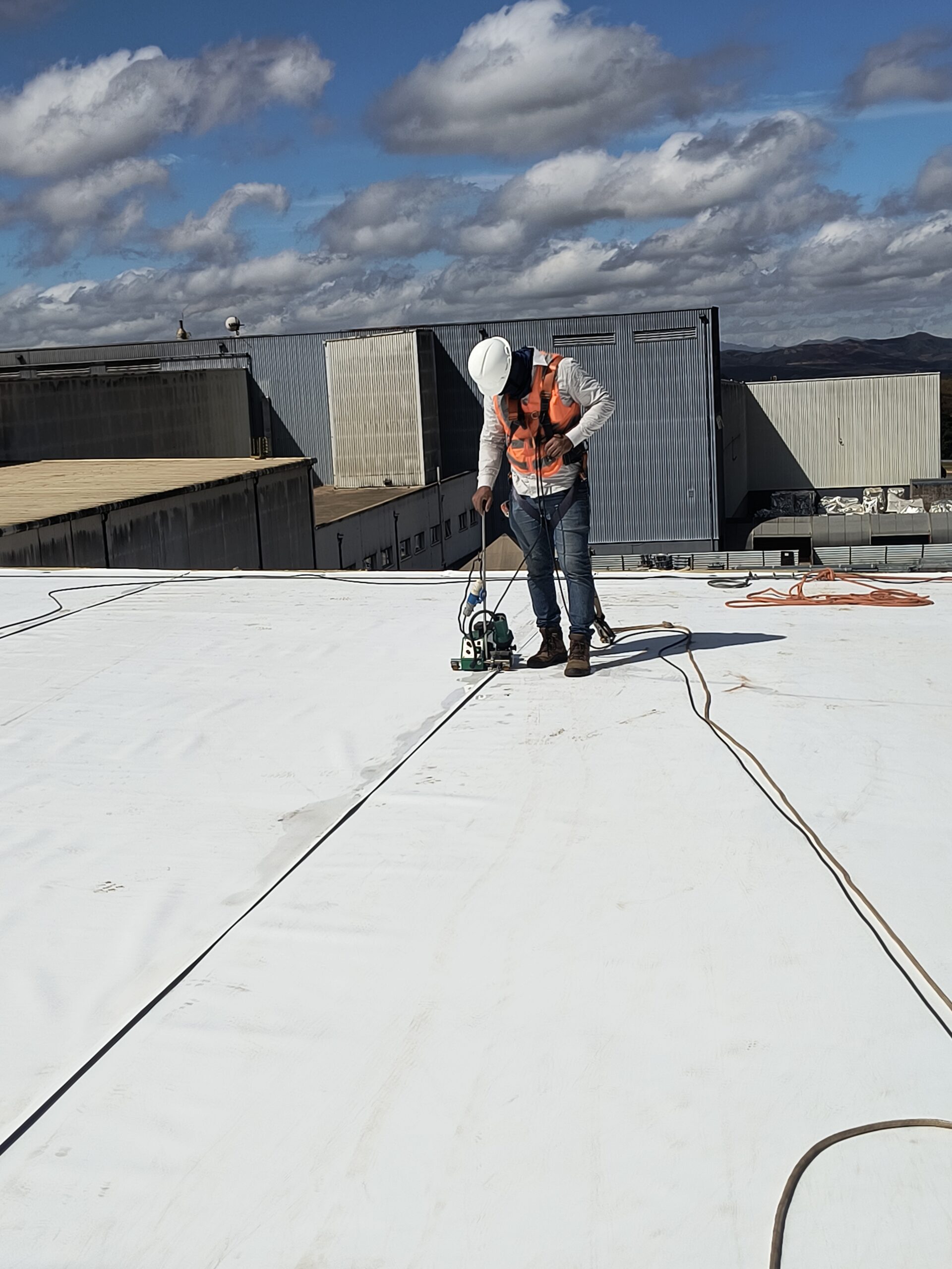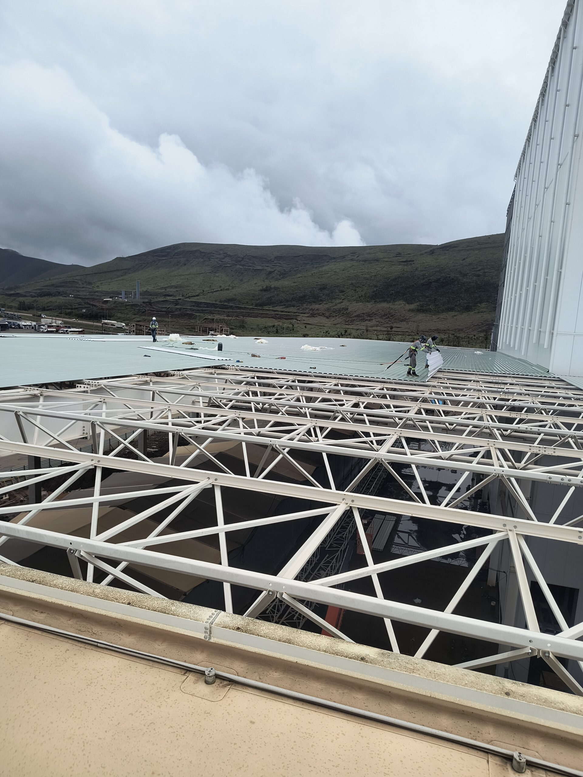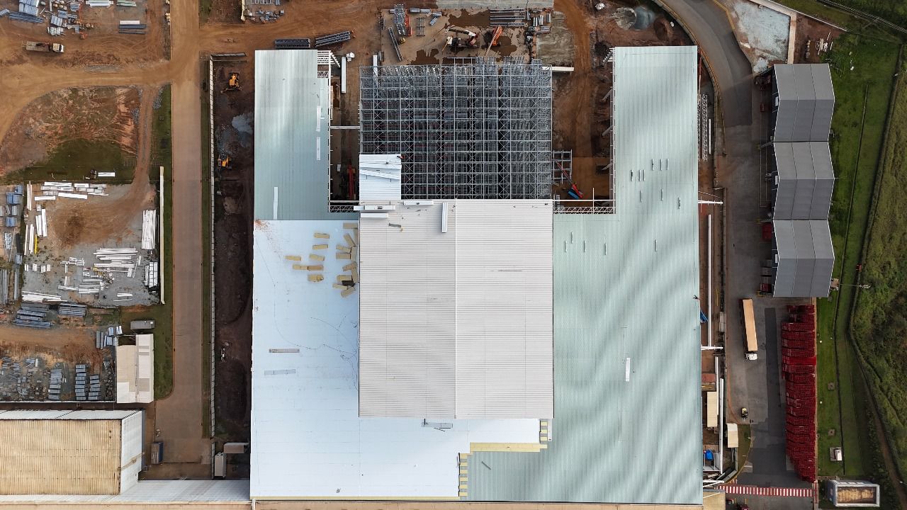Escopo: Instalação de telhas trapezoidais TP40 + PIR + TPO branco + revestimento de 12calhas + revestimento base dos domus + instalação de passarela walkway.